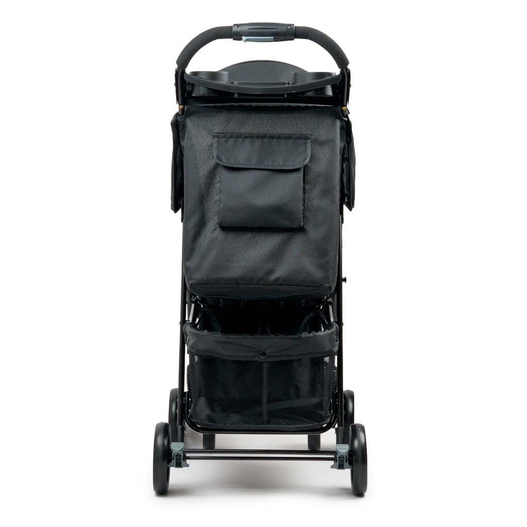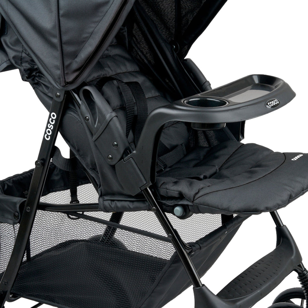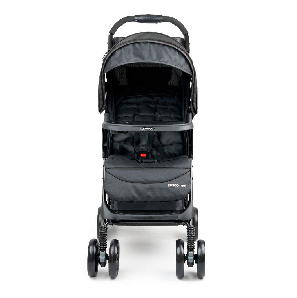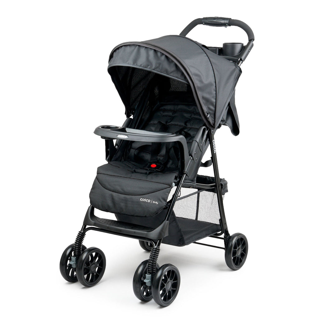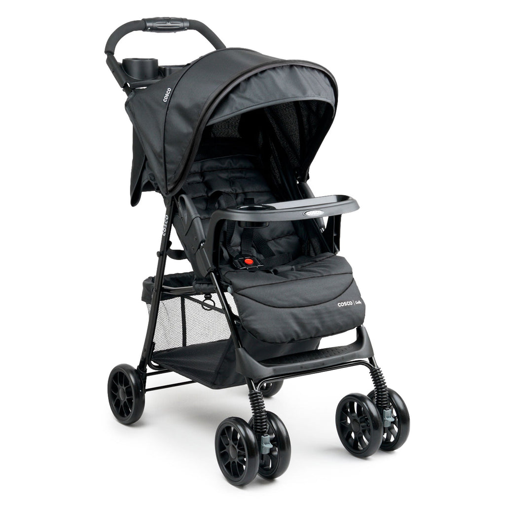 Carrinho de bebê que inclina em diversas posições, capota com UV30+, bandeja para os pais e para a criança e fechamento com uma única mão.