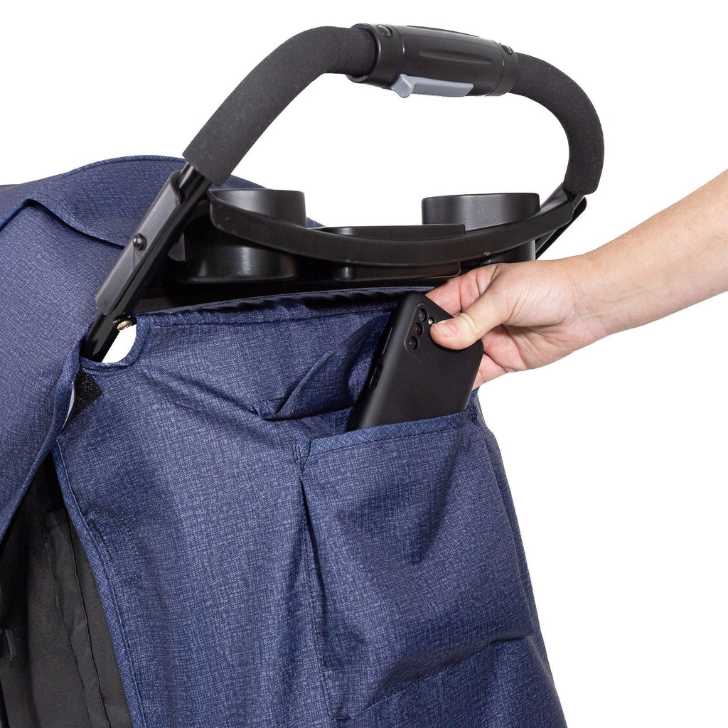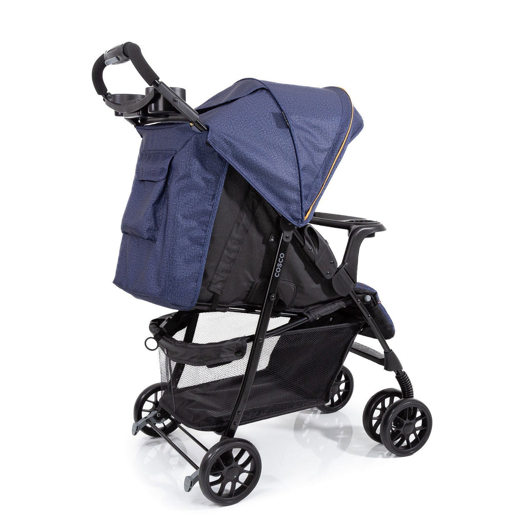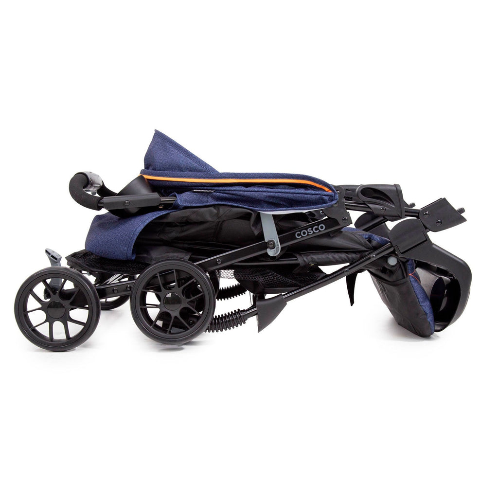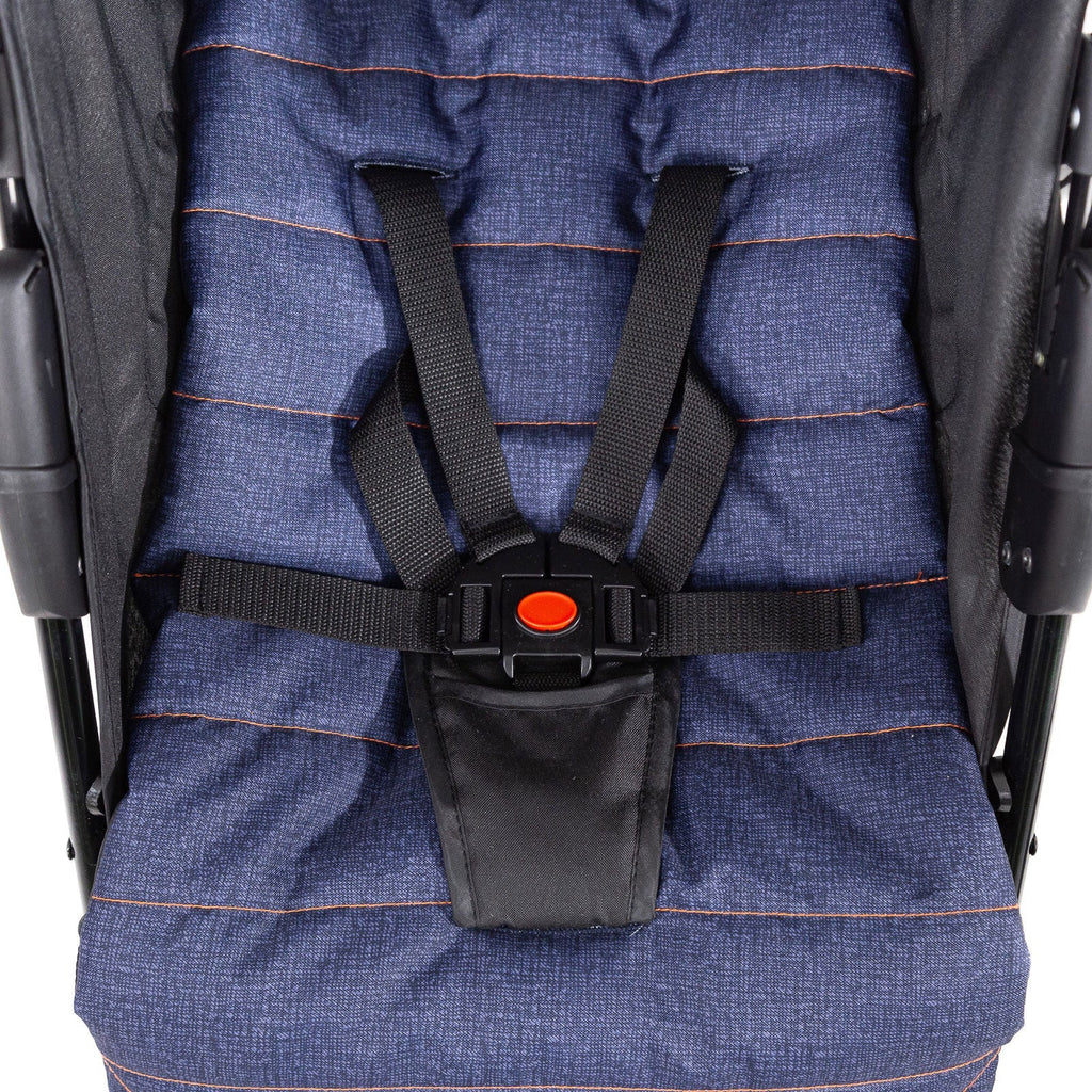 Carrinho de bebê que inclina em diversas posições, capota com UV30+, bandeja para os pais e para a criança e fechamento com uma única mão.