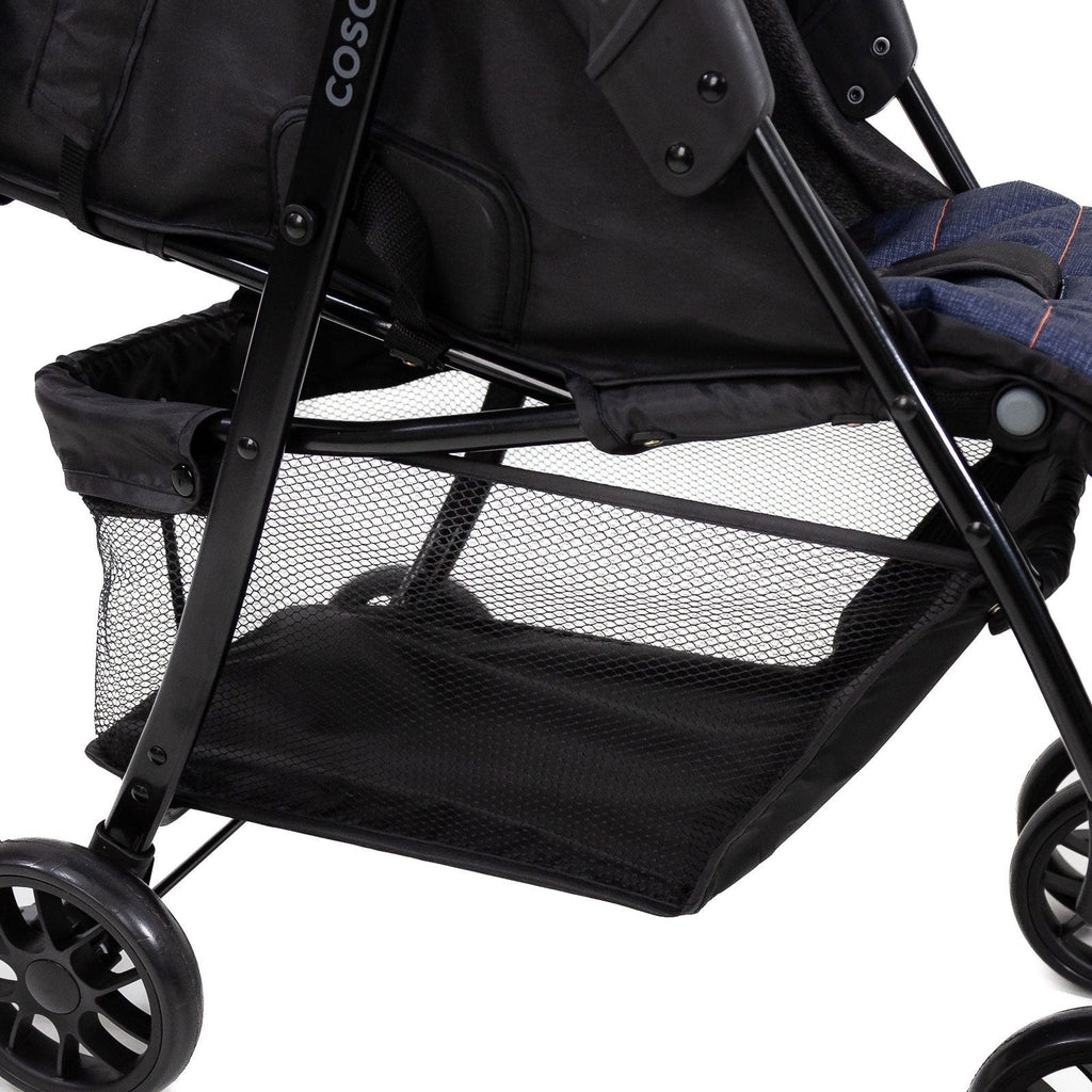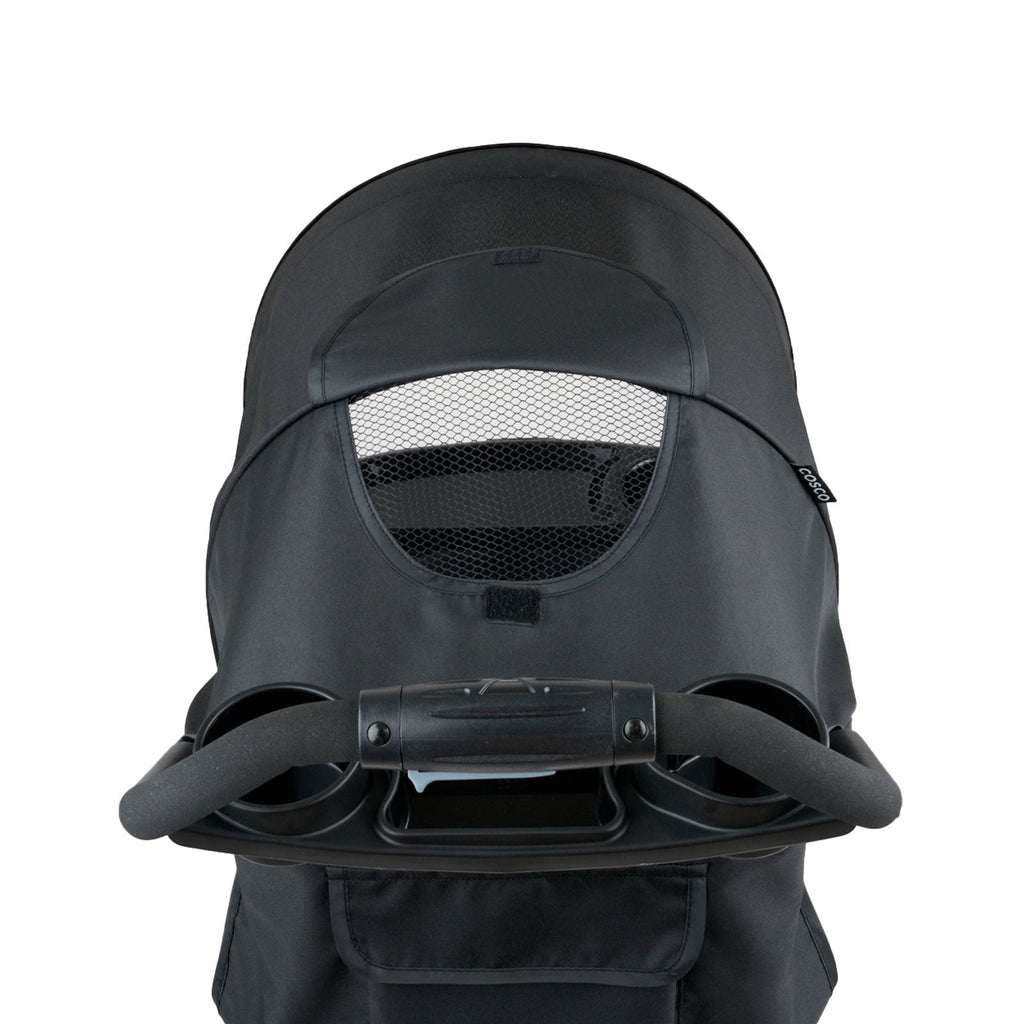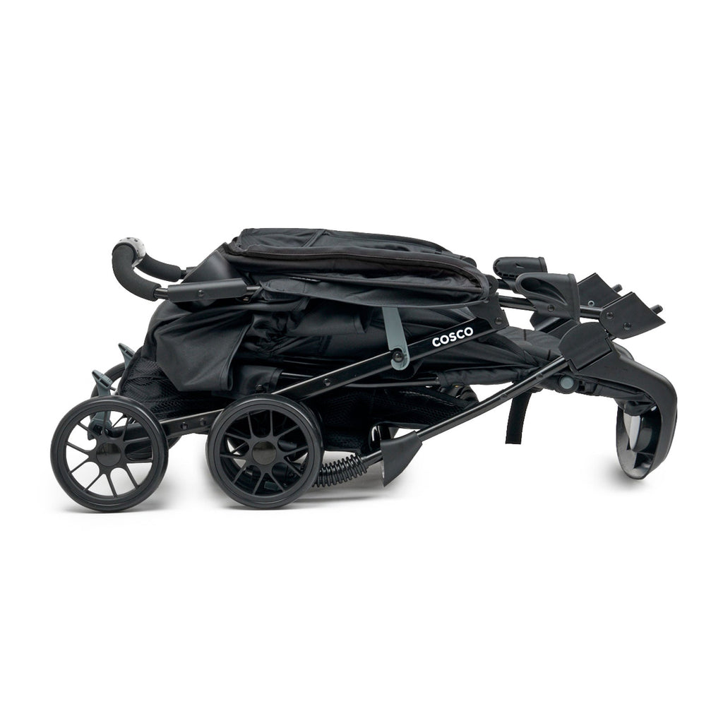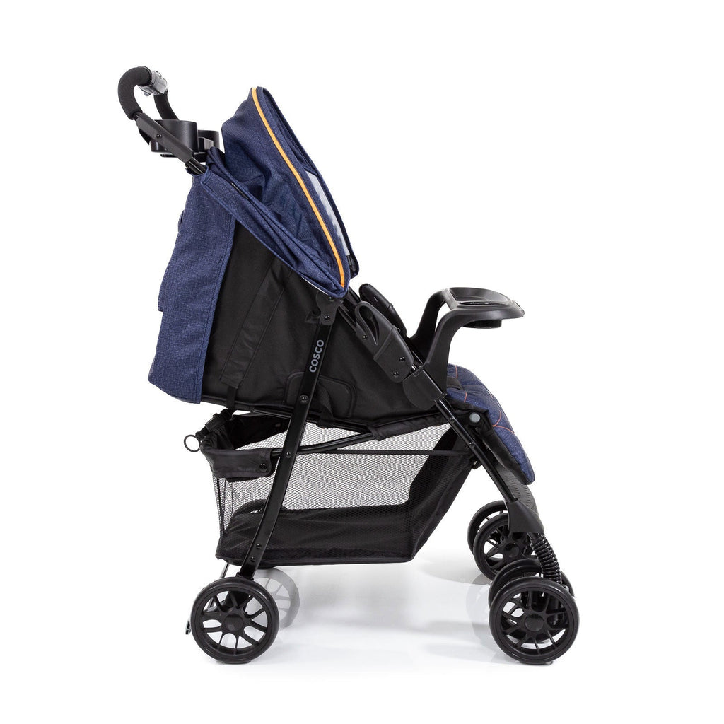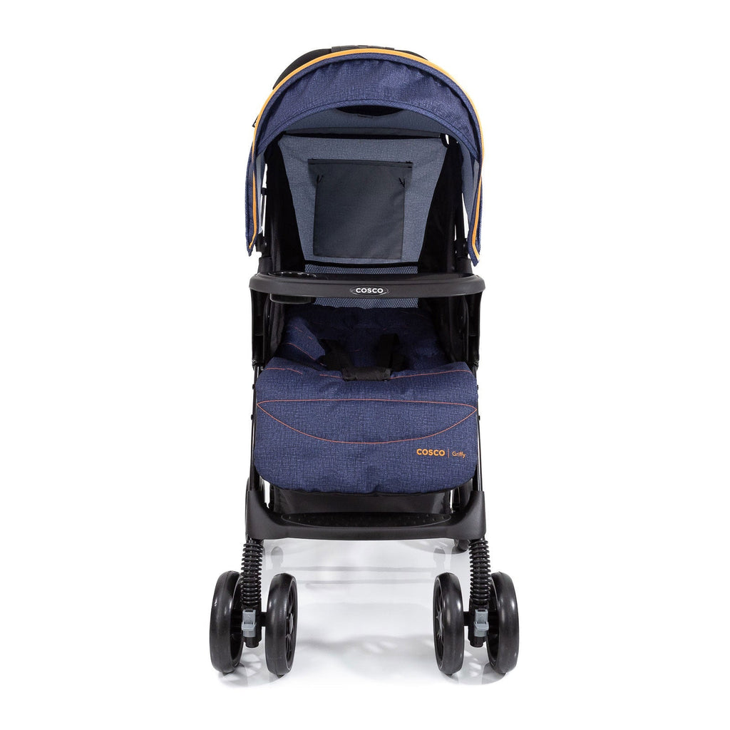 Carrinho de bebê que inclina em diversas posições, capota com UV30+, bandeja para os pais e para a criança e fechamento com uma única mão.
